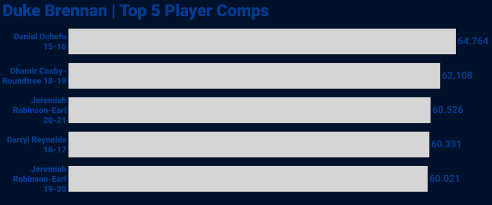 The model shows moderate statistical alignment between Brennan and his closest comparisons, with the highest Comp Score being 64.76. While this indicates a solid level of similarity, it does not reflect a perfect match. Brennan’s statistical profile is defined by elite rebounding production, as evidenced by his total rebound z-score of 3.15, which significantly exceeds those of his closest comparisons. In addition to this, his efficiency metrics and extremely low three-point z-score reinforce a strong interior-focused role. The model captures these traits but struggles to find a past Villanova season that fully matches his rebounding dominance.