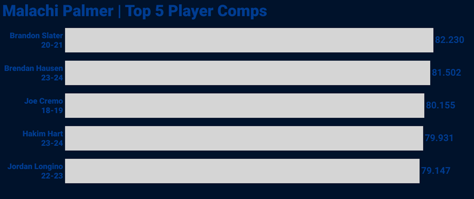 The strength of these comparisons, with Comp Scores ranging from roughly 79.15 to 82.23, highlights how well Palmer’s statistical profile fits within an established archetype at Villanova. Over the past decade, the program has consistently featured role-playing wings who complement primary guards and forwards by providing defense, spacing, and low-turnover play. Palmer’s season aligns closely with this trend, reinforcing his role as a developing contributor whose impact extends beyond traditional box score volume.
