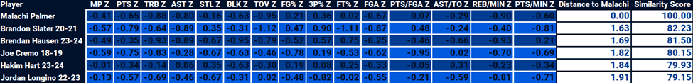 A consistent trend across all five of Palmer’s top comparisons is the profile of low-usage wings who contribute in complementary ways. These players typically have negative z-scores in scoring, rebounding, and playmaking, paired with modest or positive shooting efficiency metrics. They are not primary offensive creators, but instead provide value through efficiency, spacing, and defensive flexibility. This shared structure is evident across comparisons such as Brendan Hausen, Joe Cremo, and Jordan Longino, all of whom filled similar roles within their respective Villanova teams.