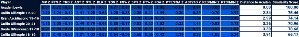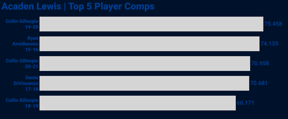 A clear trend across all five of Lewis’s top comparisons is the presence of high-usage, primary guards who drive offensive creation. Each comparison features strong assist production, positive scoring volume, and elevated involvement in the offense. Players like Ryan Arcidiacono and multiple seasons of Collin Gillespie reflect similar responsibilities as lead guards tasked with facilitating and controlling the game. However, Lewis stands out within this group due to the magnitude of his assist and steal production, as his z-scores in both categories exceed all five comparisons by a significant margin.