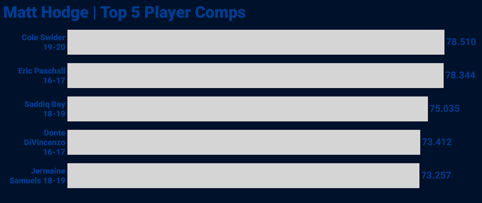 The Villanova player seasons that the StatCats2 model identified as the closest statistical comparisons to Matt Hodge are Cole Swider (19-20), Eric Paschall (16-17), Saddiq Bey (18-19), Donte DiVincenzo (16-17), and Jermaine Samuels (18-19).