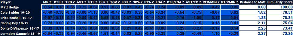 Hodge and Swider align closely as low-usage, floor-spacing forwards. Both players exhibit negative assist and steal z-scores, along with limited scoring volume, reinforcing their roles as complementary pieces rather than primary options. Their three-point shooting profiles are also similar (3P% Z = 0.45 vs. 0.30), highlighting their shared ability to stretch the floor. Additionally, both players maintain low turnover rates, indicating efficient offensive roles within limited usage. While Hodge provides more rim protection (BLK Z = 0.97 vs. 0.00), the overall statistical structure between the two remains highly comparable.