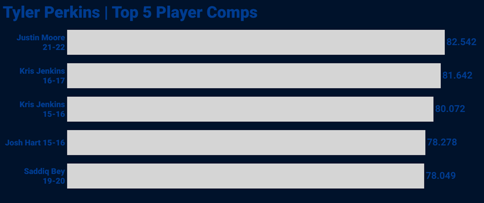 The model shows strong statistical alignment between Perkins and his closest comparisons, with a highest Comp Score of 82.54. His statistical profile reflects a well-rounded, high-impact guard/wing, combining strong scoring, rebounding, and defensive activity. Unlike more specialized players, Perkins contributes across multiple areas, with positive efficiency from three-point range and solid usage. His low turnover rate and positive assist-to-turnover ratio further highlight his efficiency. This balanced production allows the model to identify several strong comparisons among Villanova’s past versatile guards/wings.