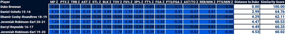 A consistent trend across all five of Brennan’s top comparisons is the combination of extremely low three-point z-scores and high field goal percentage z-scores. This pattern reflects a shared profile of rim-oriented players who operate almost exclusively in the paint. These players rely on efficiency near the basket rather than perimeter shooting to generate value. However, what separates Brennan within this group is the magnitude of his rebounding production, as his rebounding z-score exceeds all five comparisons by a significant margin, even while maintaining the same interior-focused statistical identity.