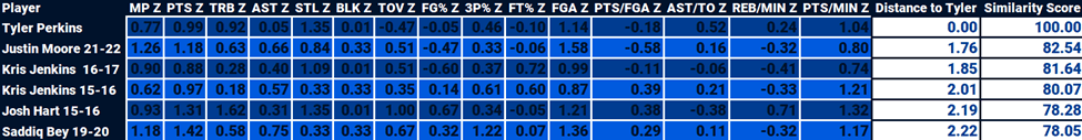 A consistent trend across all five of Perkins’ top comparisons is the presence of versatile, high-impact wings who contribute across multiple statistical categories. Players such as Kris Jenkins, Josh Hart, and Saddiq Bey all reflect this archetype, combining scoring, rebounding, and defensive activity with solid shooting efficiency. These players are not limited to a single role but instead impact the game in a variety of ways, often serving as key contributors within Villanova’s system.