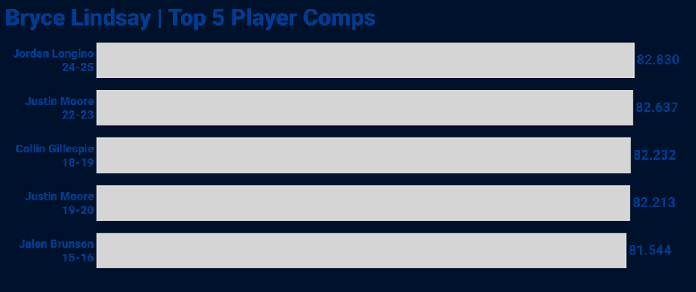 The model shows strong statistical alignment between Lindsay and his closest comparisons, with a highest Comp Score of 82.83. This indicates a high level of similarity relative to the rest of the dataset. Lindsay’s statistical profile reflects a perimeter-oriented guard with moderate scoring volume, solid playmaking ability, and above-average three-point shooting. His negative rebounding and block z-scores further reinforce his role as a guard operating primarily on the perimeter. Overall, Lindsay’s metrics fall closely in line with several past Villanova guard seasons, allowing the model to produce closer comparisons.