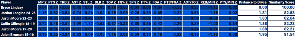 A consistent trend across all five of Lindsay’s top comparisons is the presence of guard-oriented production profiles. Each comparison features positive assist z-scores, solid three-point shooting efficiency, and negative rebounding impact, reflecting a shared identity as perimeter players. These players contribute primarily through scoring and playmaking rather than interior presence.