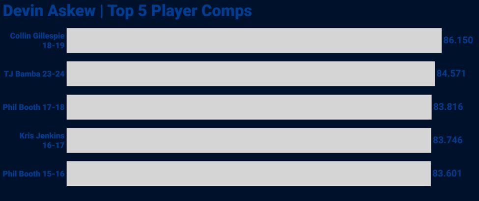The model shows strong statistical alignment between Askew and his closest comparisons, with a highest Comp Score being 86.15. This demonstrates one of the strongest matches within the dataset. Askew’s profile is defined by balanced guard production, including solid assist numbers, strong steal impact, and efficient perimeter shooting. His negative rebounding z-score and low block production reinforce his role as a perimeter guard, while his overall metrics fall closely in line with several past Villanova backcourt contributors. The combination of efficiency, playmaking, and defensive activity allows the model to identify multiple high-quality comparisons.