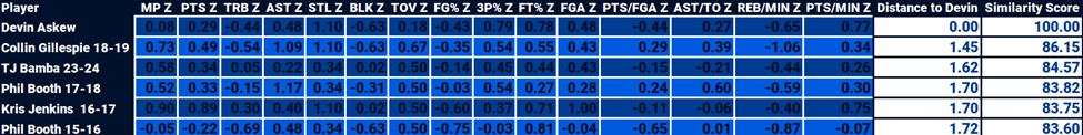 A clear trend across all five of Askew’s top comparisons is the presence of well-rounded guard play. Each comparison features positive assist and steal z-scores, along with solid shooting efficiency from the perimeter. These players contribute across multiple areas, balancing scoring, playmaking, and defensive activity. Unlike more specialized profiles, Askew and his comparisons reflect a versatile guard archetype that impacts the game in several ways without relying heavily on any single statistical category.