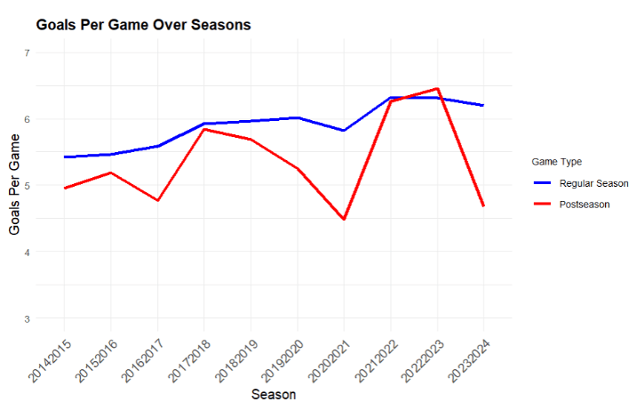 One reason for this being that scoring is generally lower in postseason games compared to regular season games. For this next figure, games ended in OT were excluded, due to format differences for consistency.
