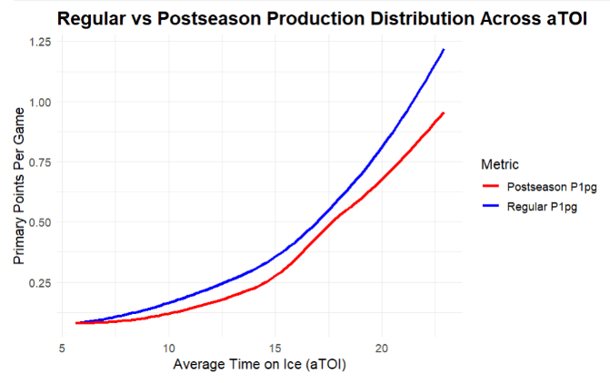 Depth being more valuable in the playoffs is evidenced by changes in lineup production distribution. The next figure to the right shows two smoothed curves, each showing the mean primary points per game at different average TOIs for forwards. Because scoring is higher in the regular season, the regular season curve remains above the postseason curve for the entire plot. The spread between the two curves minimizes in the range of 16-17.5 minutes per game and then widens as the curve trends above 20 minutes per game. Skaters playing in a more middle of the lineup role have a smaller drop in production into the postseason than both those playing significant forward minutes at 19+ per game and those playing less at around 12-15 per game.