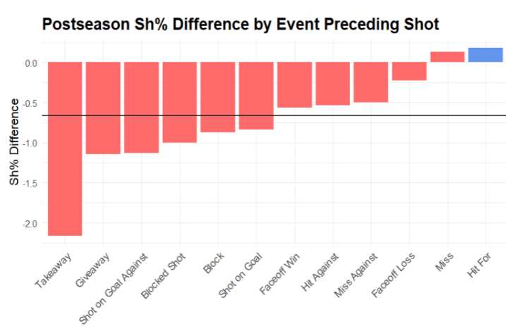 While this is notable, hits also become more effective in the postseason for generating goals. The figure on the right shows 12 events that can precede a shot attempt. The value on the y axis represents the mean difference in sh% for regular versus postseason shots. Hits for is one of two preceding event types that see a positive change in sh%. Across all 12 events, it is .72% less likely in the postseason that unblocked shot attempts convert to goals, however if following a hit for, it is .17% more likely a shot attempt is a goal. While the playoffs are more physical, this physicality is a greater catalyst to goal-scoring on a per shot basis.