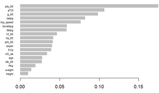 To put these RMSE values in context, it’s important to calculate a relative RMSE based on the range of P1DIF removing outliers. For forwards, there are 778 non-outlier observations resulting in a range from (-750, .600) yielding a rRMSE of 14.67% considered roughly standard for a good model. For the defenseman model there is an RMSE of .155 in an outlier-free range of (-.511, .451) resulting in an rRMSE of 16.11%, still solid, but not as effective as the forward model especially considering the defenseman model is poised for a greater risk of overfitting.