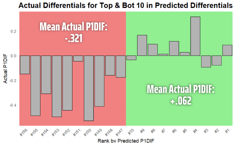 A last, more tangible way to get a sense of how the model forecasts best is to look towards the extremes of the predictions. Most important to note is that the following predictions only contain entries applied from the test data—they have never been seen by the model before, so a similar level of accuracy could be a reasonable expectation for future use. The chart on the right highlights the top and bottom 10 in terms of predicted differentials out of the 156 observations in the test data with the bar chart showing the actual differential. This yields promising results where, considering the mean P1DIF is -.096, the top 10 in predicted P1DIF are on average .75 standard deviations above the mean and the bottom 10 on average are 1.06 standard deviations below the mean. Examples of observations in the top 10 include 2021/22 Alex Iaffalo, 2020/21 Gabriel Landeskog, 2022/23 Trevor Moore, and 2022/23 Ondrej Palat. Examples in the bottom 10 include 2023/24 Mitch Marner, 2022/23 Jared McCann, 2020/21 Nikolaj Ehlers, and 2023/24 Nikita Kucherov.