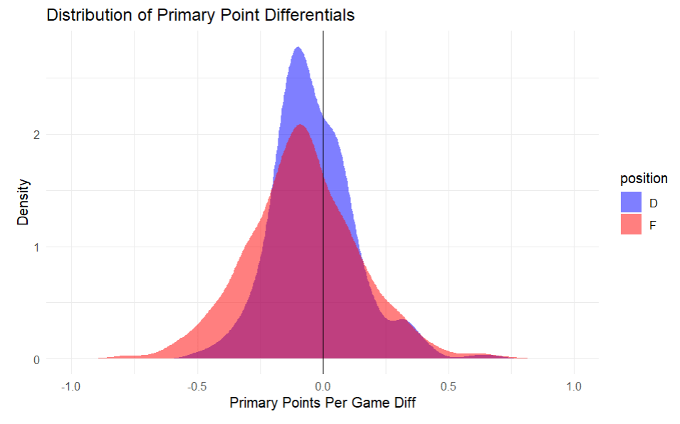One of the first considerations in forecasting individual production differentials is to gauge how general production varies from the regular season to the postseason. The main figure that will be used to stand in for production are primary points (goals + primary assists) per game. The differential is a simple equation: postseason primary points per game – regular season primary points per game and is represented by P1DIF. The figure on the right highlights slight drop-offs as skaters enter the playoffs from their regular season production. For forwards, -.08 primary points per game, for defensemen -.04 primary points per game.